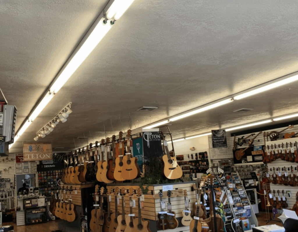 Brilled Lighting partnered with KSM Means Music, a retail music store in Logan, UT, to perform a comprehensive LED lighting upgrade. The project’s goal was to significantly reduce energy consumption while improving the store’s overall illumination to better showcase musical instruments like the Teton guitars visible in the store.